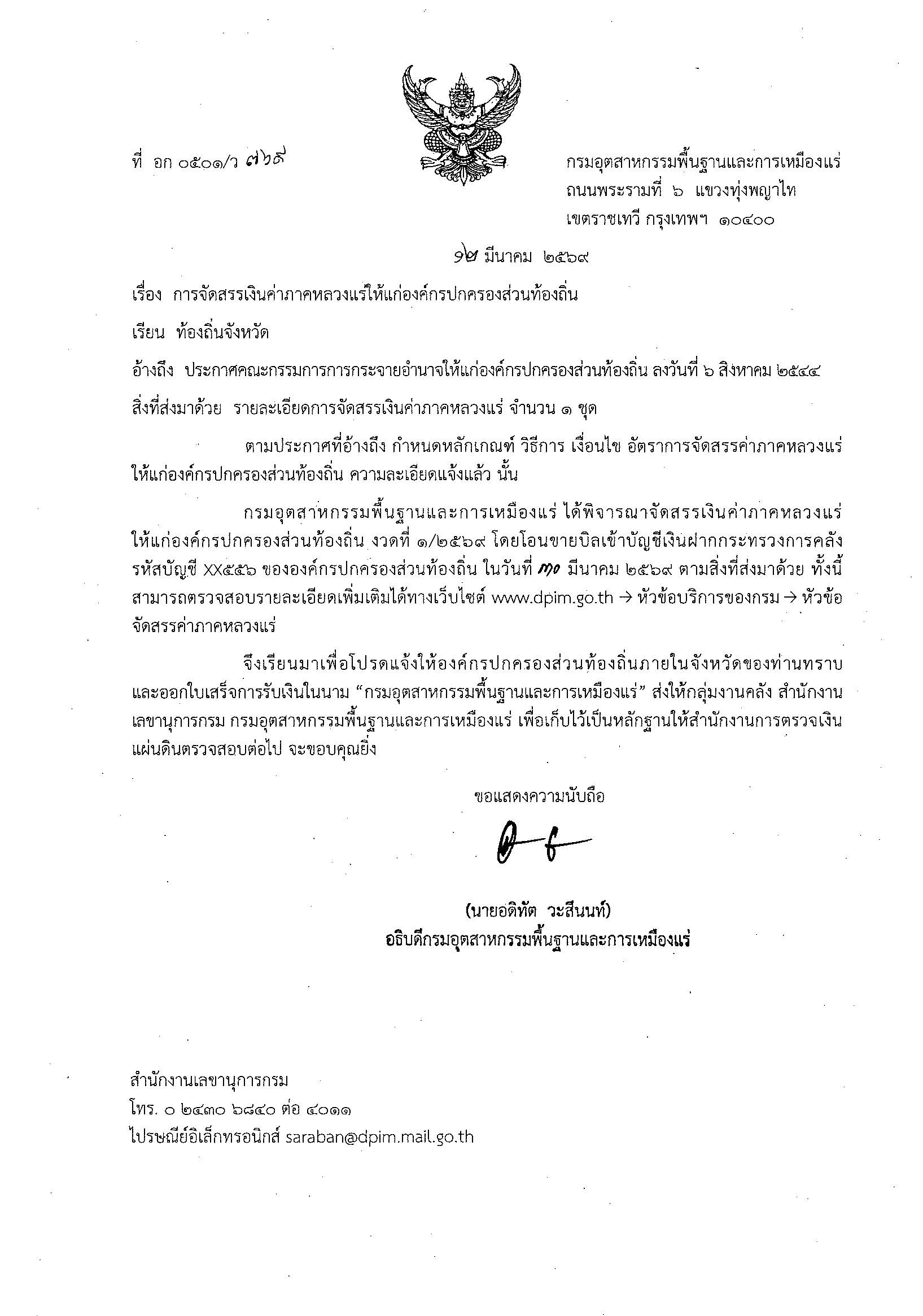 | หนังสือการอนุมัติโอนจัดสรรค่าภาคหลวงแร่ งวดที่ 1/2569 | ดาวน์โหลด |